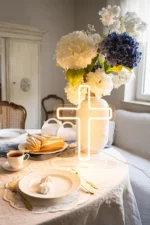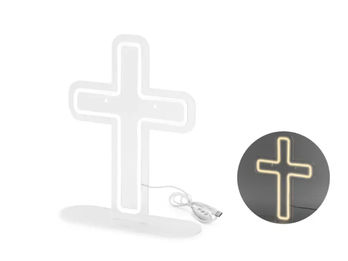Neon LED – Krzyż w kolorze białym na przeźroczystym tle o ciepłej białej barwie światła. Rozmiar krzyża ok. 41×30 cm., długość kabla z wtyczką wynosi około 1,5 metra. Zestaw zawiera NEON, podstawkę i wieszak do mocowania na ścianie. Moc znamionowa wynosi 8-10W, napięcie znamionowe to 5V, a rodzaj wtyczki to USB.