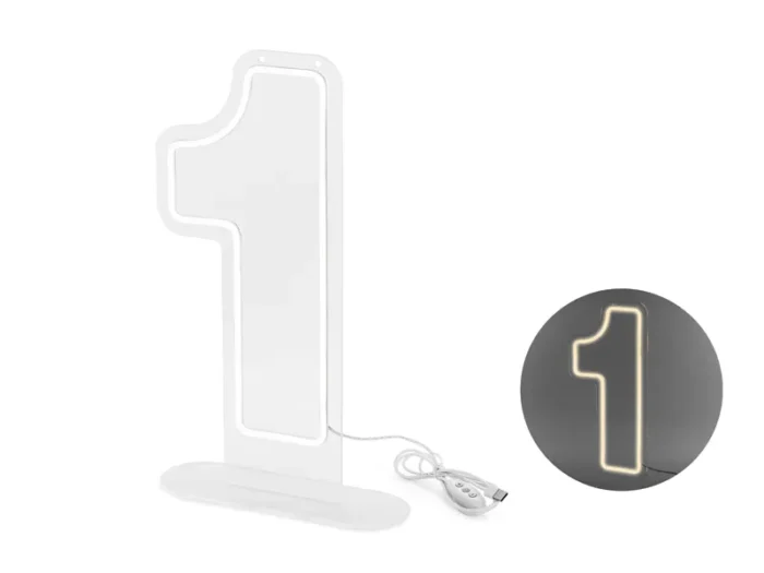 Neon LED – Cyfra ”1” w kolorze białym na przeźroczystym tle o ciepłej białej barwie światła, wysokość ok. 50 cm, długość kabla z wtyczką ok. 1,5 m. Możliwość regulacji intensywności świecenia. Zestaw zawiera NEON, podstawkę do postawienia cyfry i wieszak do mocowania na ścianie. Moc znamionowa: 8-10W, napięcie znamionowe: 5V, rodzaj wtyczki: USB.